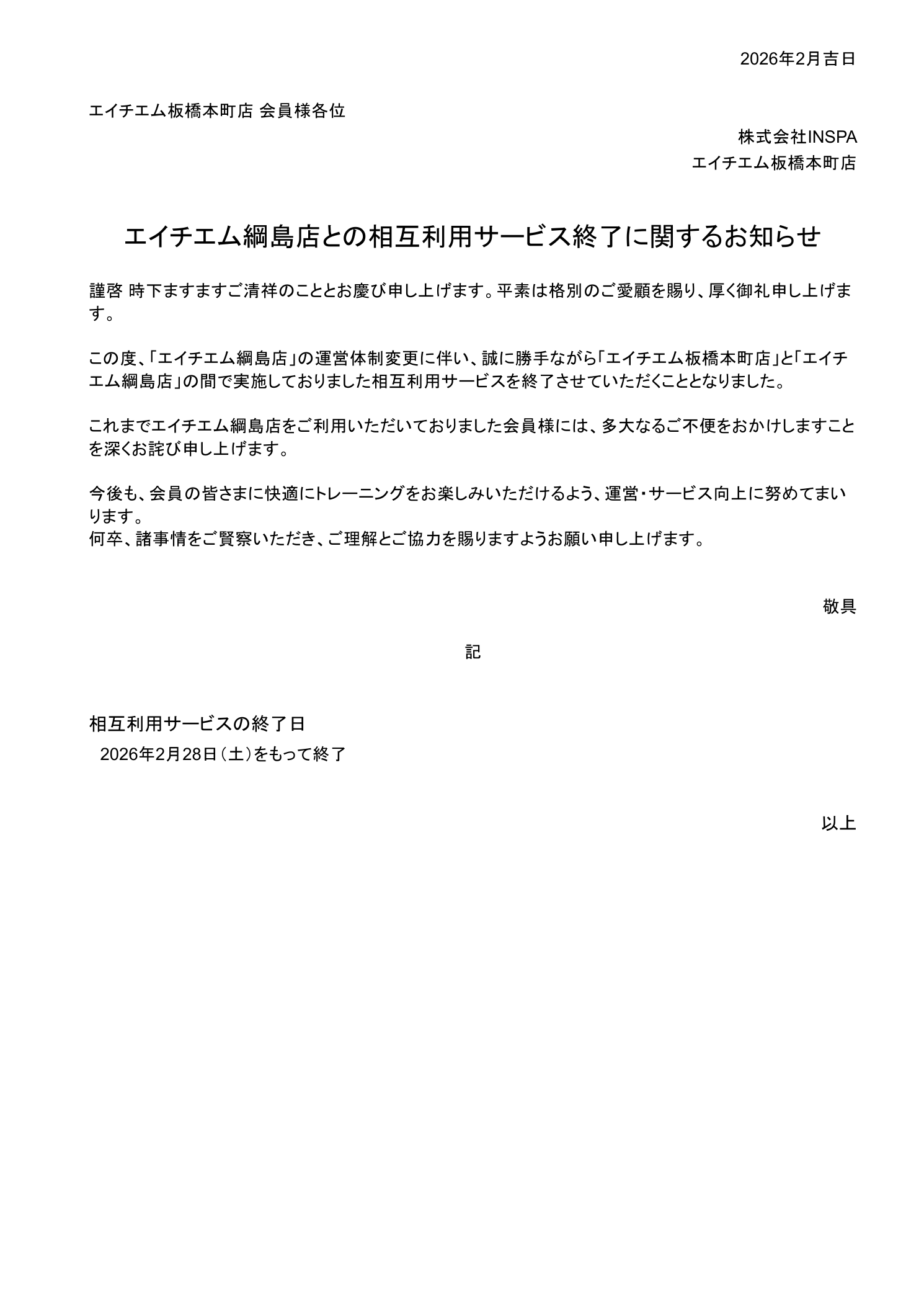 エイチエム綱島店との相互利用サービス終了に関するお知らせ